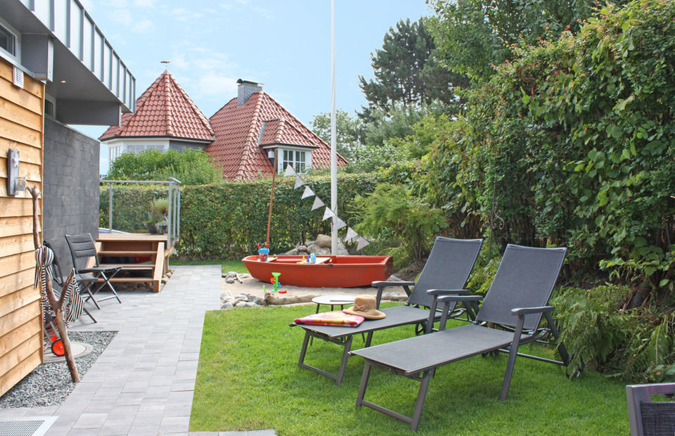 Die großzügige, nach Süden liegende Terrasse, bietet genügend Platz für einen großen Tisch für 6 Personen, einen großen Ampelsonnenschirm, einen hochwertigen Gas grill, Sonnenliegen und einen Strandkorb.